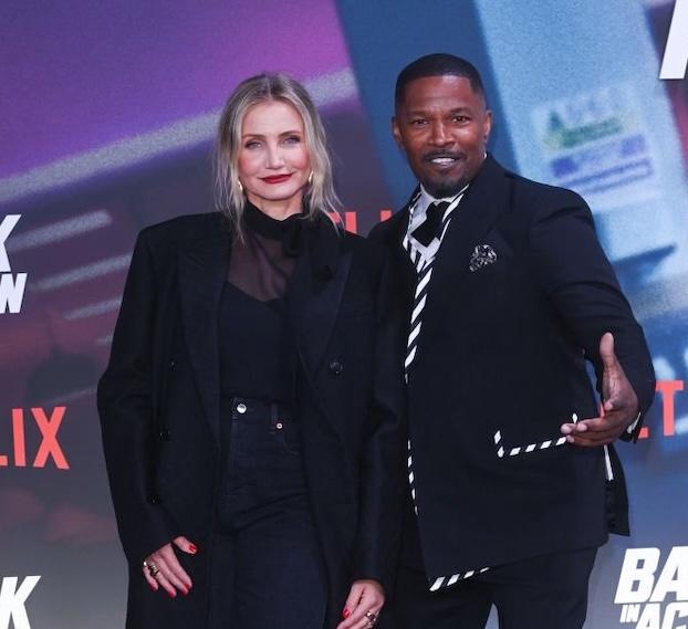 After an extended break from acting, Cameron Diaz stunned on the red carpet once again at the premiere of her new Netflix film, Back in Action, alongside co-star Jamie Foxx. This marked Diaz’s first movie premiere in a decade, her last being for Annie in 2014. The premiere took place in Berlin, and Diaz made a striking appearance in an all-black outfit—complete with a sheer blouse, high-waisted jeans, and a long coat. At 52, she radiated confidence, posing for the photographers solo and with Foxx, who himself turned heads in a bold black-and-white striped suit.