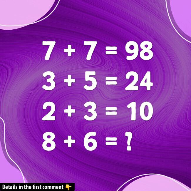 Ready to give your brain a workout? In today’s challenge, we present a series of deceptively simple “addition” problems that hide a clever mathematical twist. If you think 7 + 7 always equals 14, think again! Study these examples, spot the hidden pattern, and see if you can determine the value of 8 + 6. Dive in, test your logic, and don’t forget to share your answer and thought process in the comments below!