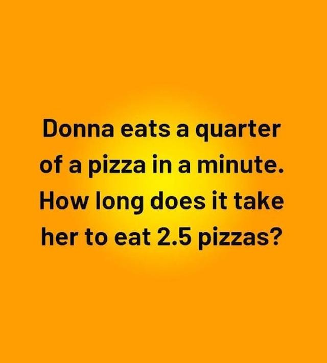 Puzzles like this one are a fun way to test your logic and attention to detail – but don’t be surprised if it stumps you! In this puzzle, we ask a simple question: “How long does it take Donna to eat 2.5 pizzas if she eats a quarter in one minute?” Most people think they have the answer at first glance, but small details often lead to mistakes. Take a moment to solve it yourself, then check the answer to see if you fall within the top 20% who get it right!