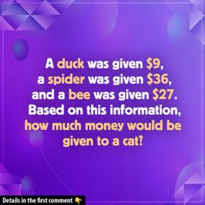 Can you solve this tricky puzzle? A duck, a spider, a bee, and a cat have been given certain amounts of money, but the twist is in…