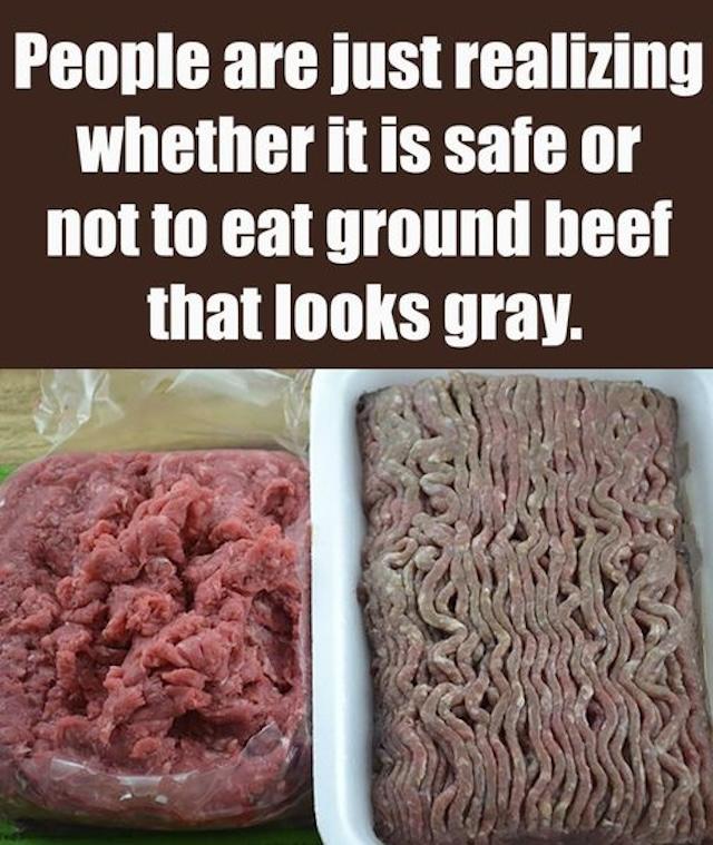 Ground beef that’s turned gray and brown throughout. When the color shift is widespread, it may be a sign of spoilage