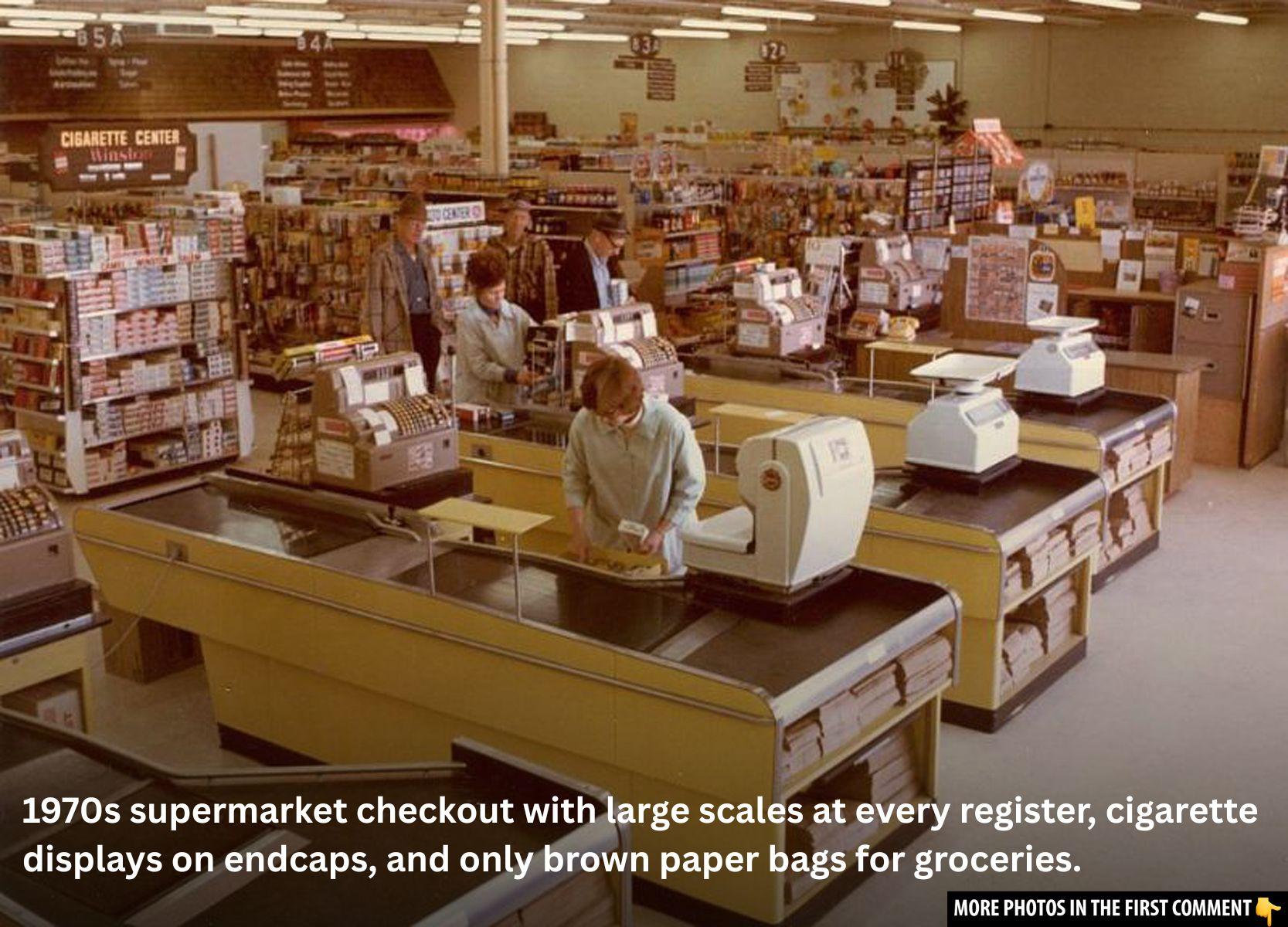 A typical grocery shopping scene in the 1970s.